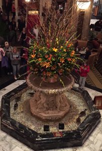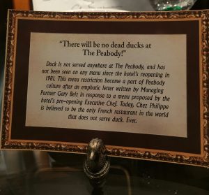 We arrived just in time to witness a famous daily event at the Peabody Hotel. As guests and just curious people like us gather around a fountain in the lobby of this regal hotel, a bellman escorts the ducks down from the “penthouse” of the hotel to the fountain every day at 11:00 am. There they stay being fed, doing lots of laps, having lots of photo ops, till at 5:00 pm when they are marched backup to the roof. The Peabody Duck March is internationally known. Until this day, I had never heard of this. But I am a fan and took a few photos myself.