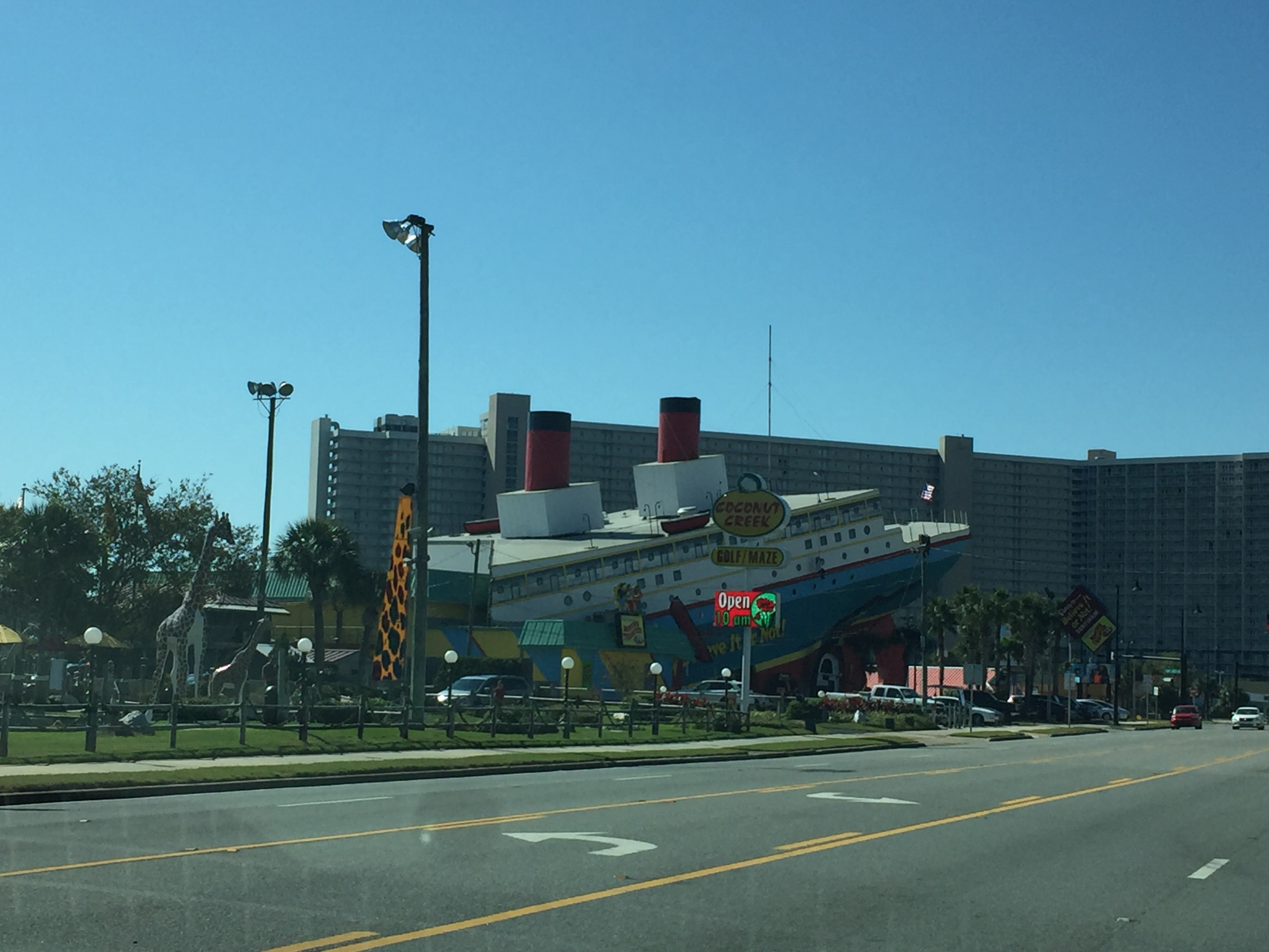 Sidebar here. Walmart and rest area’s! Dave pondered in an earlier post about our new found intrigue with dollar stores. Need to give a shout out to Walmart! We have shopped or stopped at as many Walmart’s as Dollar Stores. Maybe more. Lost count. Those big parking lots and low prices are traveler’s with large 5th wheels a “yippy” find. This one on our way to our next destination had the Titanic I think right next to the parking lot! And the rest area’s south of NJ. Wow. Click on the little film short here titled “Rest Area Adventure” of Clifford getting a window wash at a Florida rest stop.